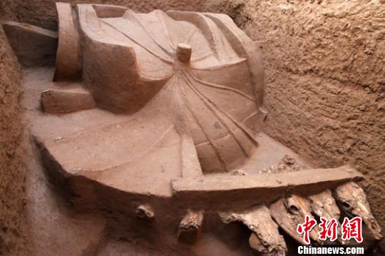 资料图。图为甘肃马家塬战国墓地一墓葬内出土的车辆与伞。甘肃省文物考古研究所供图