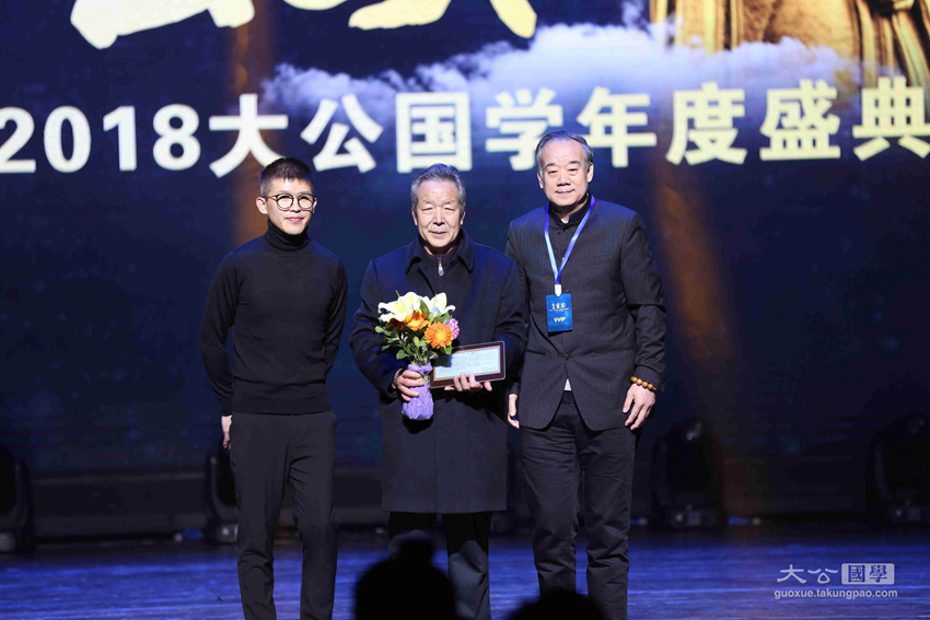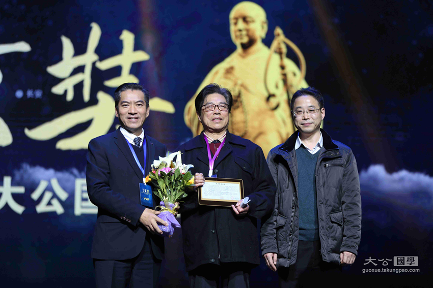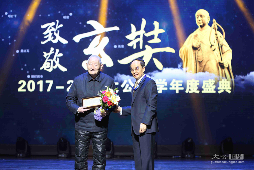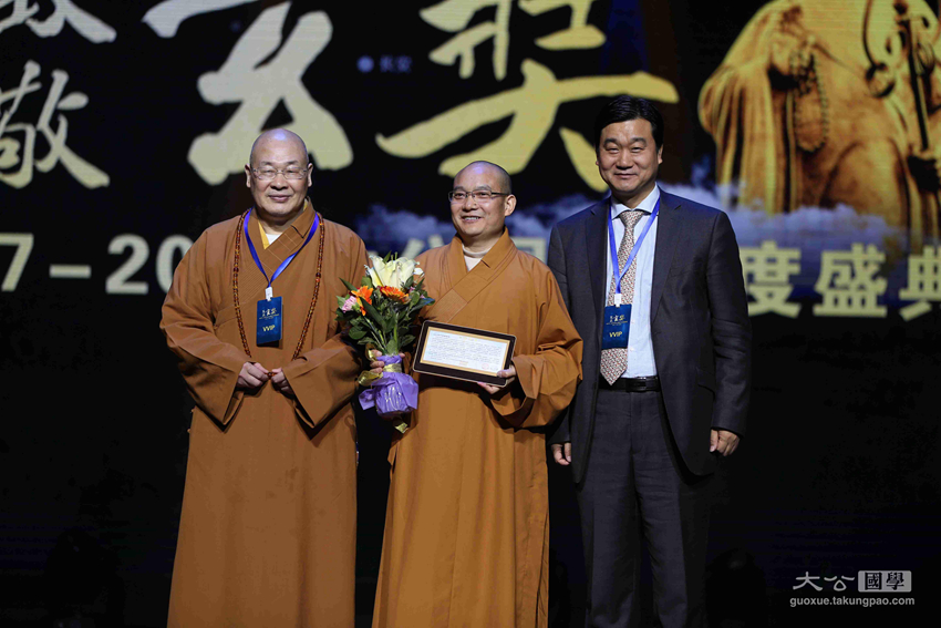 中国社会科学院世界宗教研究所教授黄夏年,香港大公文汇传媒集团副总经理江正银为获奖者张佩琛颁发中华文化玄奘奖之传承大奖