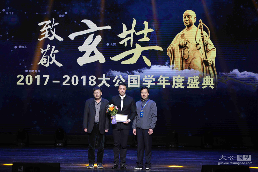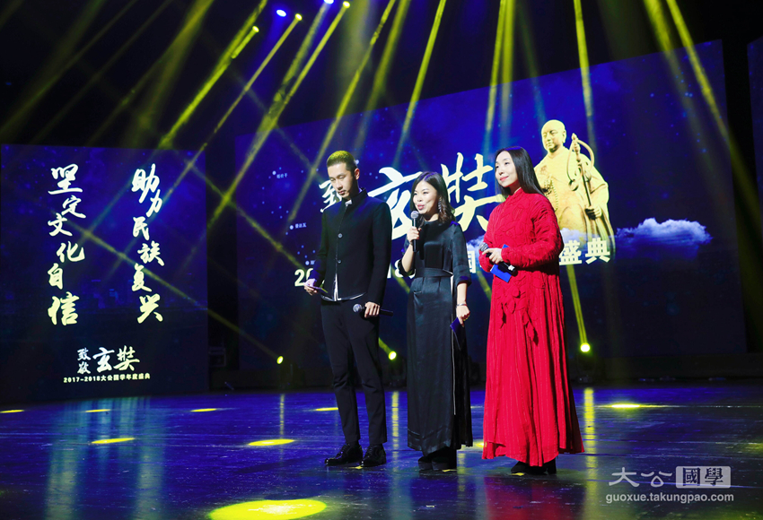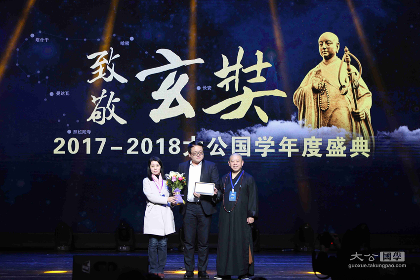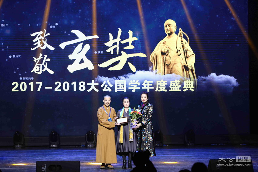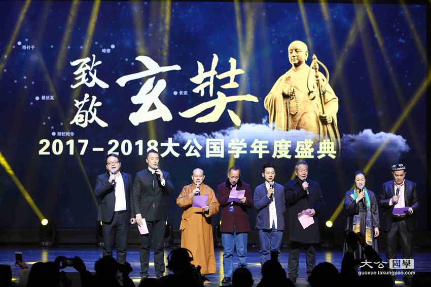 为继承和传播中华优秀传统文化,弘扬玄奘精神,1月31日晚,由大公报、中国网、大公网、光明希望公益基金会联合主办,大公国学承办的以“坚定文化自信,助力民族复兴”为主题的第一届“致敬玄奘——2017–2018大公国学年度颁奖典礼暨中华文化玄奘奖颁奖典礼”盛装举行。原中联部副部长、第十一届全国人大外事委员会副主任委员马文普,中国国际投资促进会会长、原五矿集团董事长苗耕书,香港大公文汇传媒集团副总经理江正银,香港新闻工作者联会会长、第十届十一届全国政协委员张国良,深圳市委外宣办主任韩望喜,大公报社委、大公网总裁林学飞,原中央驻港联络办公室机关工作部部长韩淑霞,原国家宗教事务局外事司副司长赵建政,大公宗教国学事业部执行总裁、大公网副总编辑史利伟,中华社会救助基金会副秘书长、光明希望公益基金会副主席张雪雁,中国佛教协会副会长、湖南省佛教协会会长圣辉法师,中国佛教协会副会长、江西省佛教协会会长纯一法师,佛光山港澳总住持永富法师,香港儒释道功德同修会会长黄维溢,浙江省绍兴市道教协会会长、龙瑞宫住持孔云鹏,北京大学宗教文化研究院副院长、哲学系教授李四龙,中国社会科学院世界宗教研究所教授黄夏年,台湾慈济发言人何日生,中国网资讯中心总监詹海涛,中华社会救助基金会光明希望公益基金副主席吴慈欣博士等领导及嘉宾出席了颁奖典礼,并为获得中华文化玄奘奖之传承奖、传播奖、创新奖以及终身荣誉成就奖的十位获奖者颁奖。来自海内外的1000余名观众在深圳保利剧院现场见证了本次颁奖盛典。