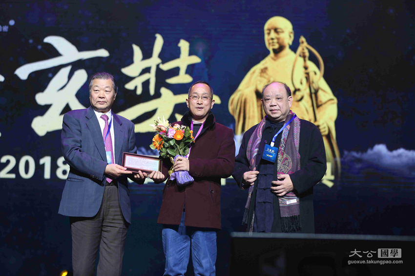华南师范大学历史文化学院院长陈文海,台湾慈济发言人何日生为获奖者李祥盈颁发中华文化玄奘奖之传承大奖