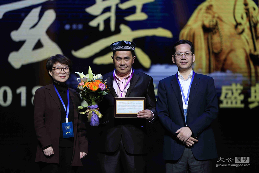 大公报社委、大公网总裁林学飞,光明希望公益基金会副主席张雪雁为获奖者热合曼·阿木提颁发中华文化玄奘奖之传承大奖