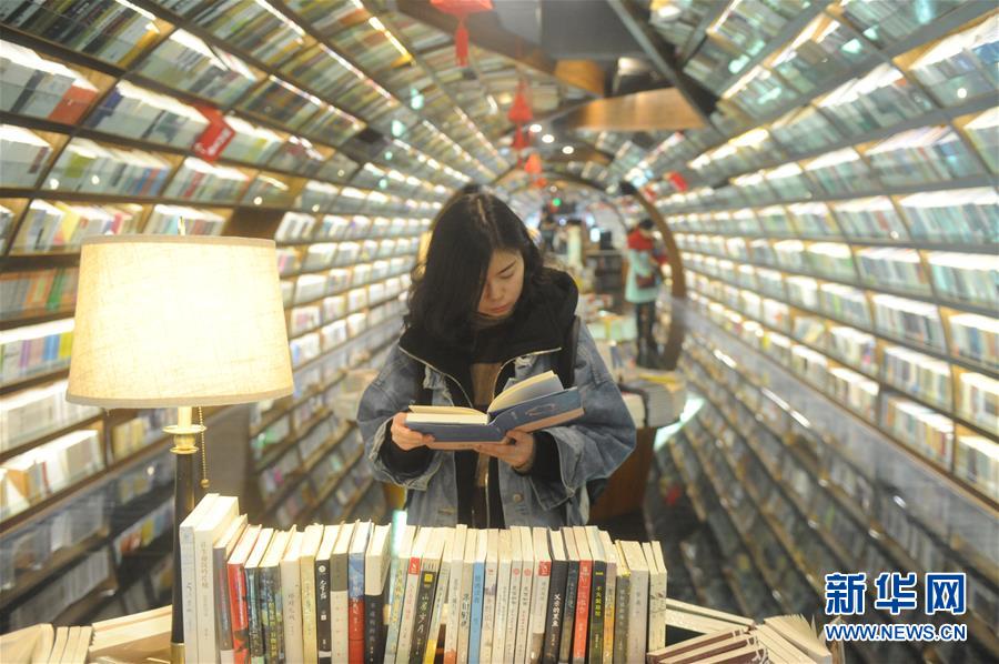 2月18日,一名读者在江苏扬州钟书阁书店选书。春节假期,人们选择在图书馆和书店度过,为自己“充电”,在书香中过个别样春节。 新华社发(濮良平 摄)