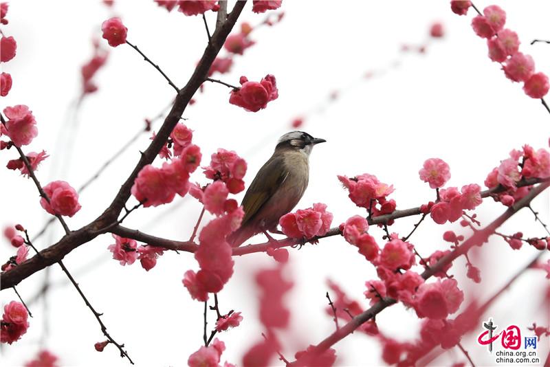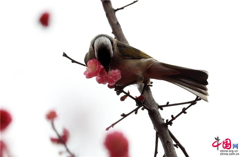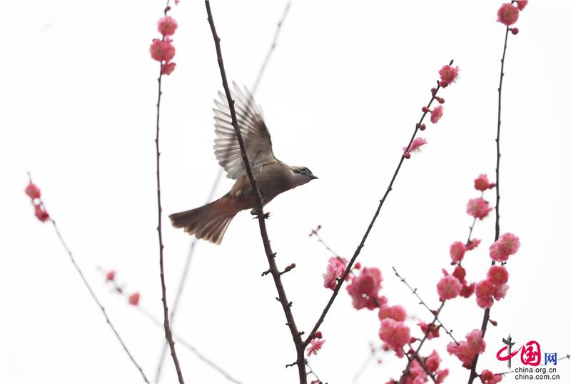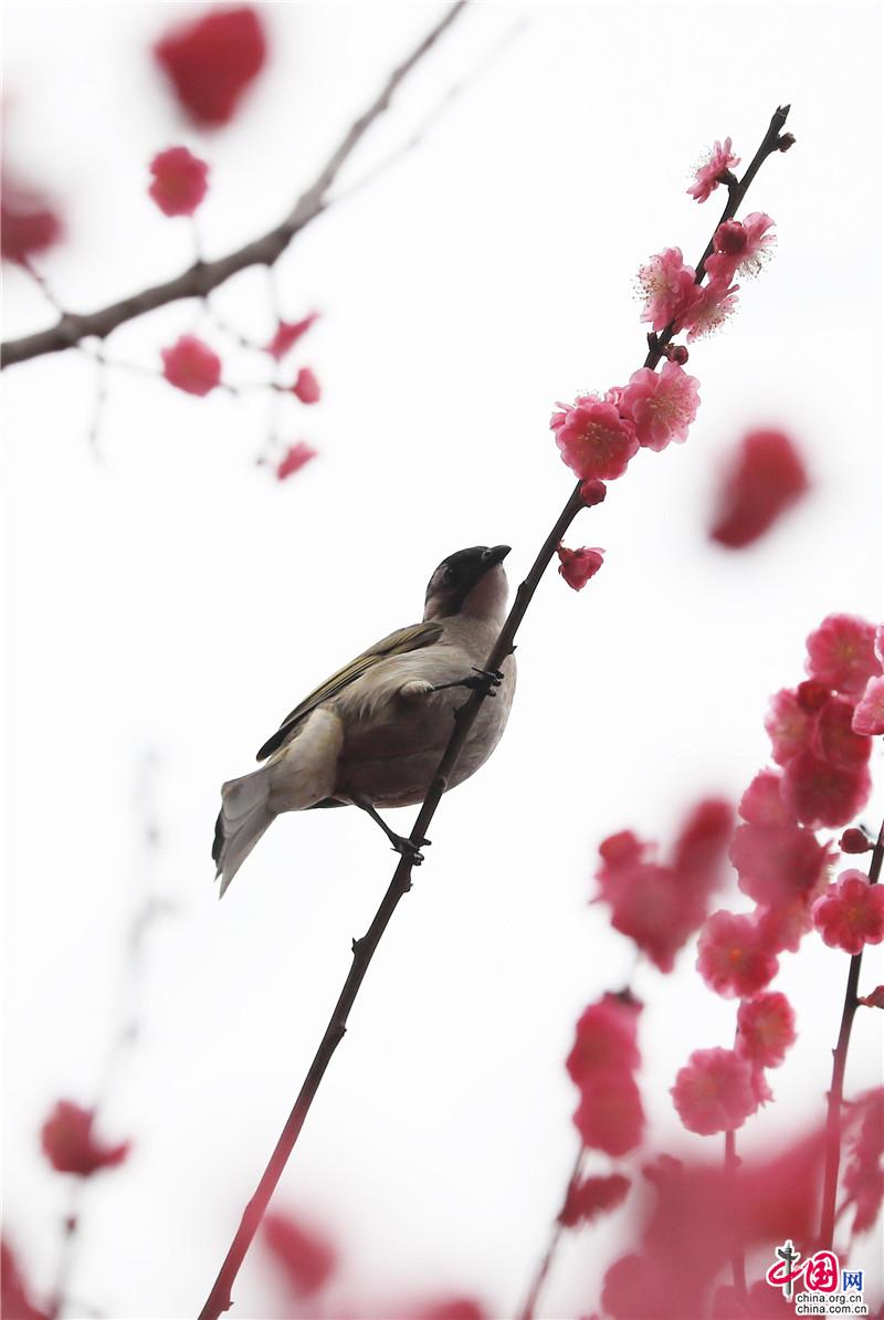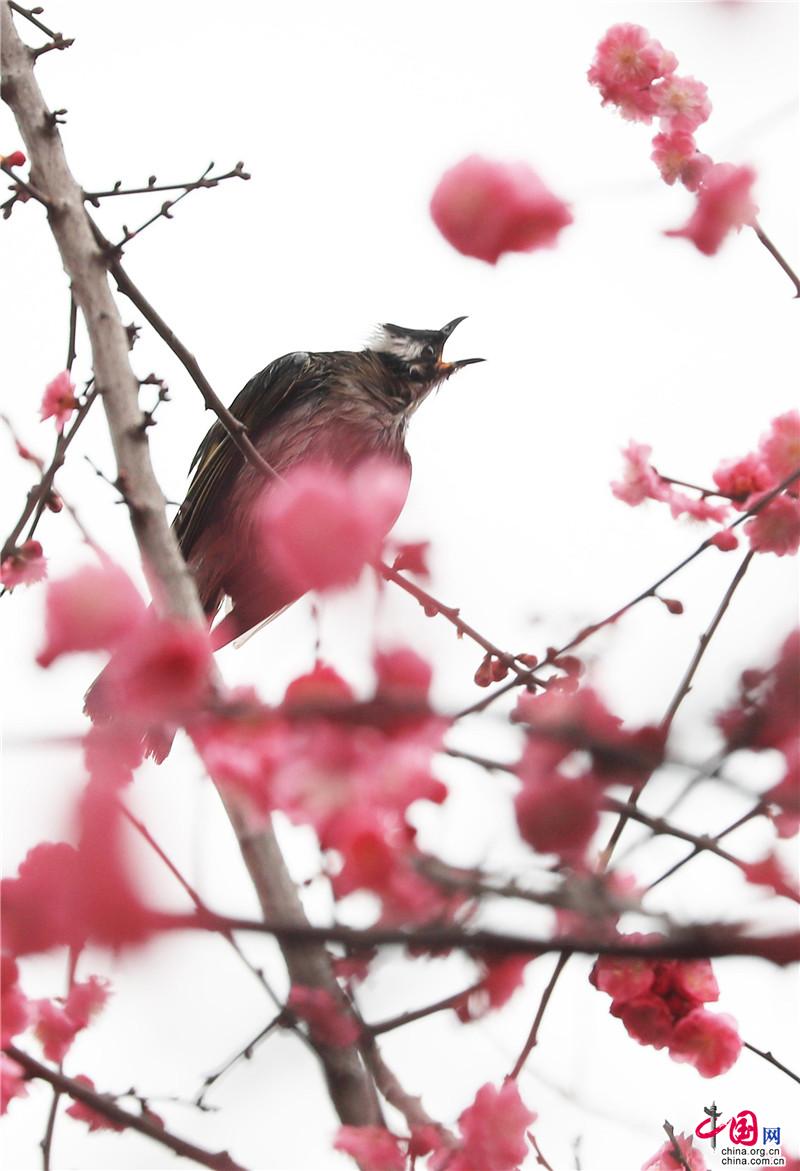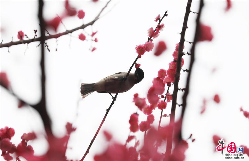 随着气温回升,四川省华蓥市华蓥山广场蓥城首座小区内的红梅花儿竞相绽放,引来各种小鸟吸取花蜜或歇息,构成一幅幅“红梅花儿迎春开,小鸟枝头春意闹”的花鸟画。