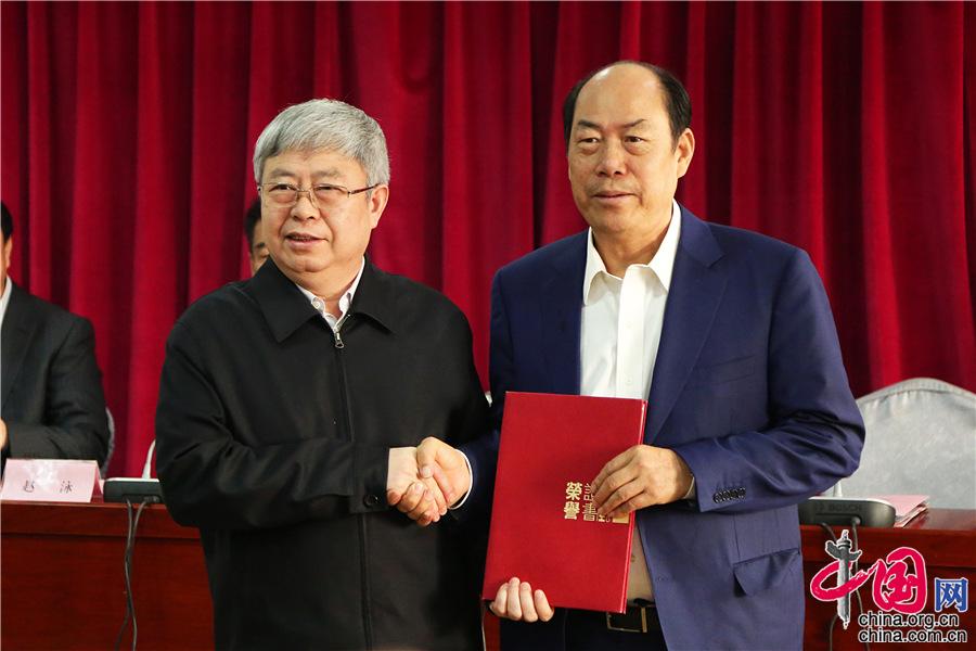 “光明扶贫行动·白内障复明”项目启动仪式上,国务院扶贫办主任刘永富向碧桂园集团董事局主席杨国强颁发荣誉证书。中国网记者 仵楠 摄