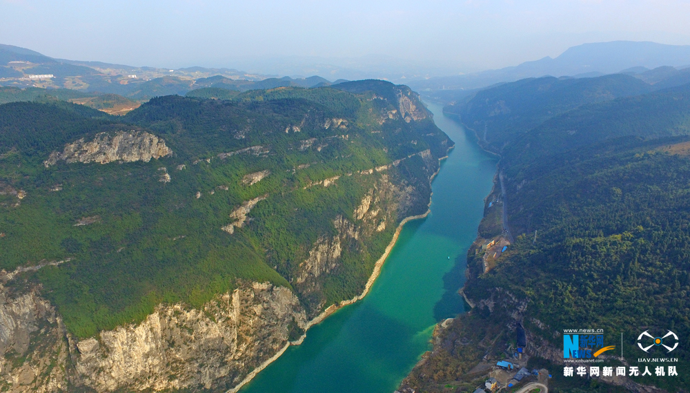 重庆涪陵乌江三门峡全长10公里,下距乌江与长江两江口仅7公里,被誉为千里乌江的第一峡。其自古以来以奇险闻名,故有“乌江天险”之称。图为2月25日航拍乌江三门峡小溪口,水碧若琉璃,山壮丽雄奇,宛若一幅波澜壮阔的天然山水图画。新华网发(李辉 摄)
