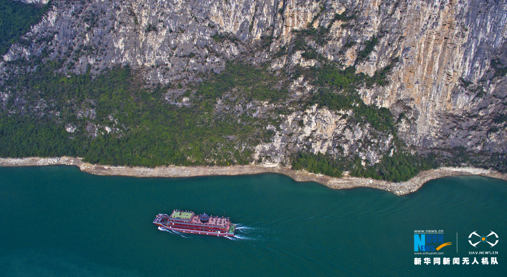 重庆涪陵乌江三门峡全长10公里,下距乌江与长江两江口仅7公里,被誉为千里乌江的第一峡。其自古以来以奇险闻名,故有“乌江天险”之称。图为2月25日航拍乌江三门峡小溪口,游船从陡峭石壁驶过。新华网发(李辉 摄)