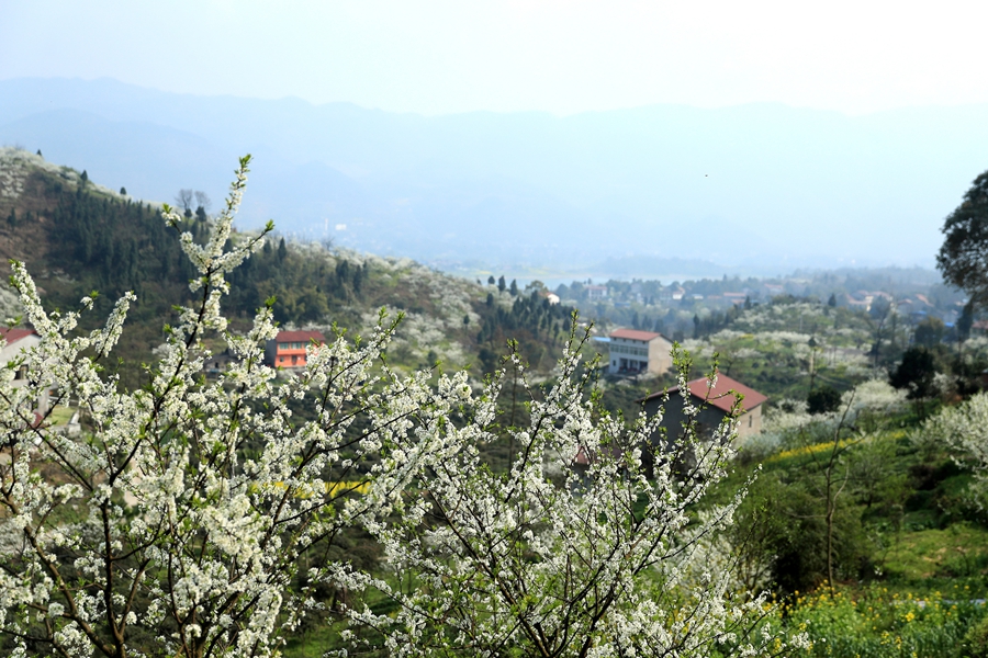 2018年3月14日,依托李子产业走上致富之路的四川省华蓥市天池镇仁和村,在漫山遍野如雪的李花映衬下显得格外美丽祥和 (特约摄影邱海鹰 摄)