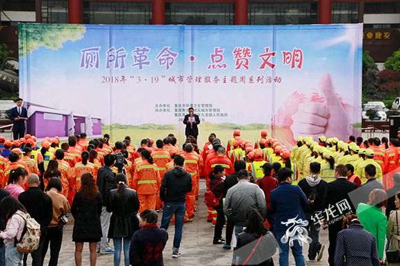 3月21日,由重庆市环境卫生管理局主办,重庆市九龙坡区城市管理局协办的2018年“3·19”城市管理服务主题周系列活动——“厕所革命·点赞文明”在九龙坡区巴国城举行。来自主城各区环卫工代表及九龙坡区市民300余人参加了活动。