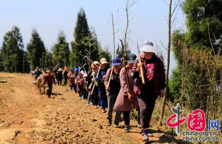 4月2日,四川省广安市的植树队伍向华蓥山中段李子垭走来