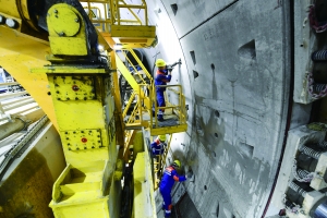 工人们在盾构现场用两尺长的螺栓将管片固定和连接。