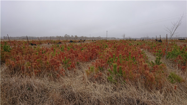 如今的绿化基地,已经水草丰美。可谁能想到,在最初考察基地时,考察团队只见到一棵老榆树遗骸,如一位张开双臂的老人,向天控诉生命的完结。正是春日,辽阔的沙地却有两副面孔:一面是樟子松青翠油亮,低矮却生机勃发;一面却是植被遭羊群啃尽后的荒芜光景。