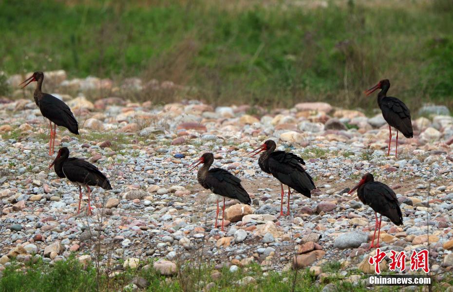河北石家庄平山岗南水库下游滹沱河段发现成群黑鹳,最多时达12只。中新社发 于英杰 摄