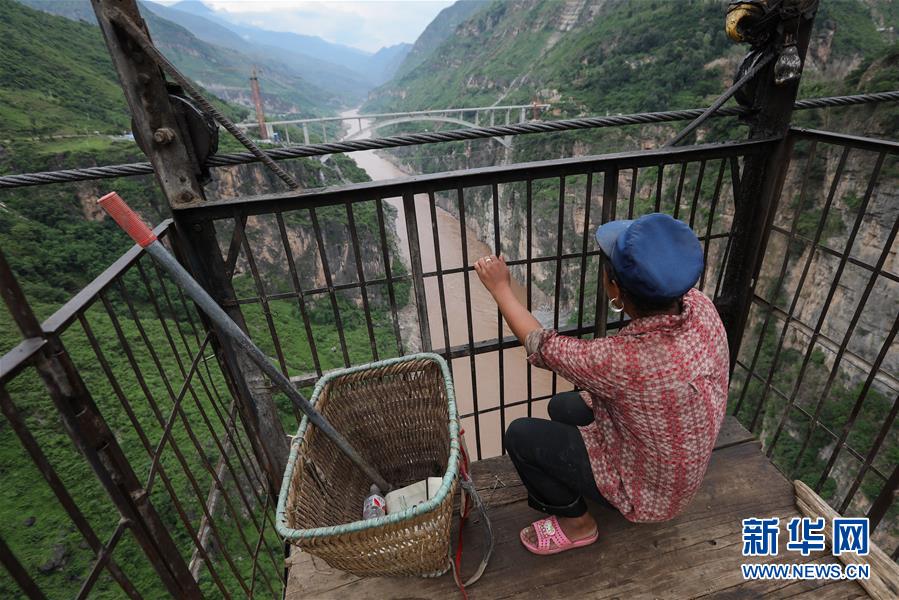 7月9日,一位四川布拖县冯家坪村村民坐溜索从巧家县鹦哥村回家。新华社记者 江宏景摄