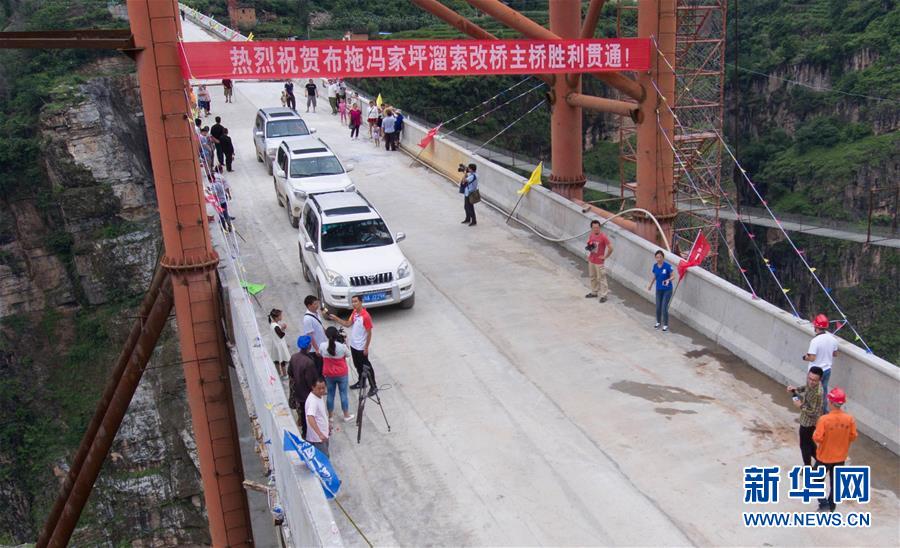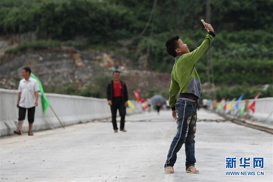7月10日,四川冯家坪村的吉立莫你作在贯通后的跨江大桥上为家人拍照留念。 新华社记者 江宏景摄