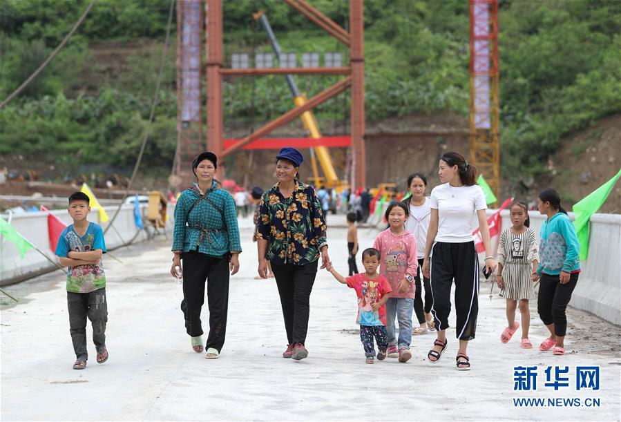 7月10日,四川冯家坪村的吉立莫你作(右三)一家行走在贯通的跨江大桥上。 新华社记者 江宏景摄