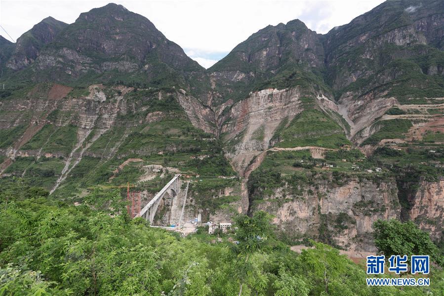 从布拖县冯家坪村俯瞰布拖县冯家坪金沙江“溜索改桥”项目跨江大桥(7月8日摄)。新华社记者 江宏景摄