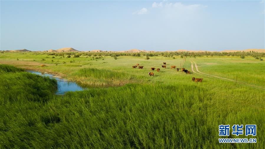 内蒙古杭锦旗位于库布其沙漠中的生态修复景观(7月11日无人机拍摄)。 新华社记者彭源摄