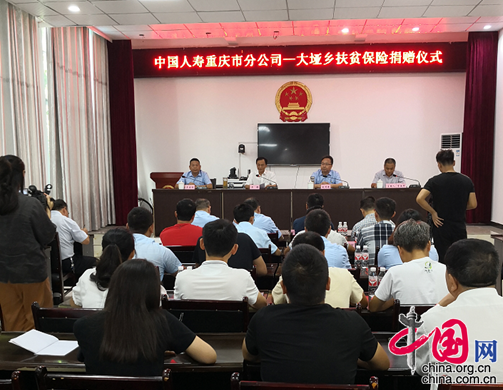 中国网8月9日讯 8月8日,重庆市城乡建委扶贫集团成员单位—中国人寿重庆市分公司在彭水县大垭乡举行“中国人寿重庆市分公司-大垭乡扶贫保险捐赠仪式”。中国人寿重庆市分公司总经理刘月进、副总经理吴国胜,彭水县委副书记、县长石强,副县长李运军及县级相关部门负责同志参加捐赠仪式。