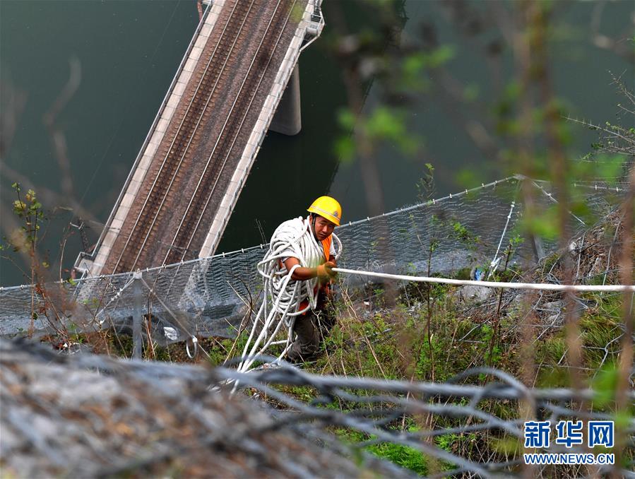 8月9日,抢险人员从侯月铁路柏枝隧道上方山顶垂降,准备进行碎石作业。 新华社记者李嘉南摄