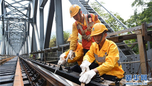 8月14日,“护桥卫士”在工长周子义(中)的指导下对钢梁大桥温调器进行检查和养护作业。位于重庆市北碚区的嘉陵江铁路钢梁大桥建于1970年。由于当时受施工技术限制,横跨嘉陵江只能采用钢梁桥全木枕结构。整座大桥全长336米,距离江面高度达50米,全桥有1000根枕木,是襄渝铁路的“咽喉”要道,每天承担着近百趟旅客列车及重载货物列车通行任务,至今已“服役”48年。由于该桥的特殊性,越是极端的天气对大桥的影响越大,在大桥桥头常年驻守着一群来自中国铁路成都局集团有限公司重庆工电段的“护桥卫士”,他们身着防护服、头戴安全帽、腰系安全带,对这座大桥进行不间断的检查养护作业,以保障铁路桥梁的安全畅通。新华社记者唐奕 摄