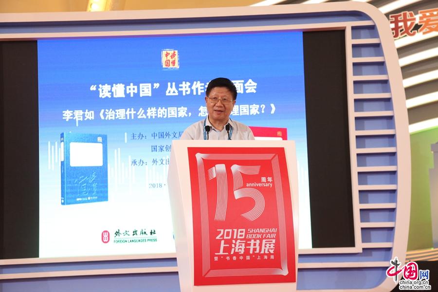 8月15日下午,由中国外文局、国家创新与发展战略研究会主办,外文出版社承办的“‘读懂中国’丛书:李君如《治理什么样的国家,怎样治理国家?》作者见面会”在当天开幕的2018上海书展主展场中心活动区成功举行。“读懂中国”丛书作者代表、中央党校原副校长、国家创新与发展战略研究会常务副会长李君如,中国外文局副局长陆彩荣,外文出版社社长、总编辑徐步,中国浦东干部学院院务委员刘靖北,上海闵行区宣传部副部长朱奕,上海创新与发展战略研究会秘书长叶孝慎,苏州国家安全局局长李耀军等出席活动。