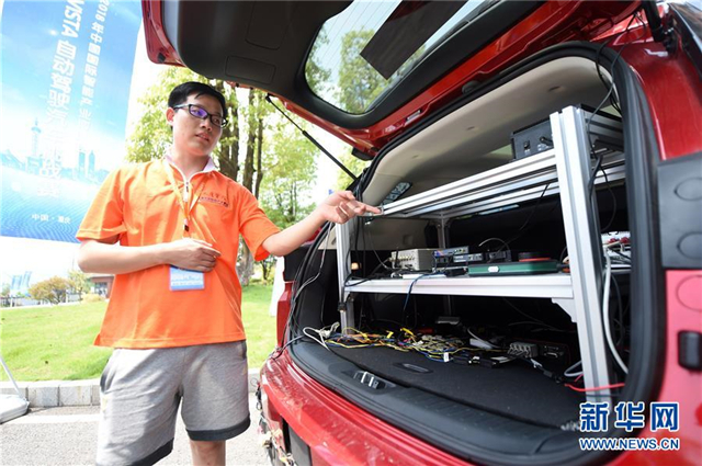 8月19日,一名参赛者在介绍安装于汽车后备箱的自动驾驶设备。