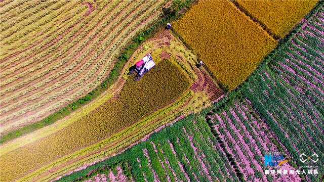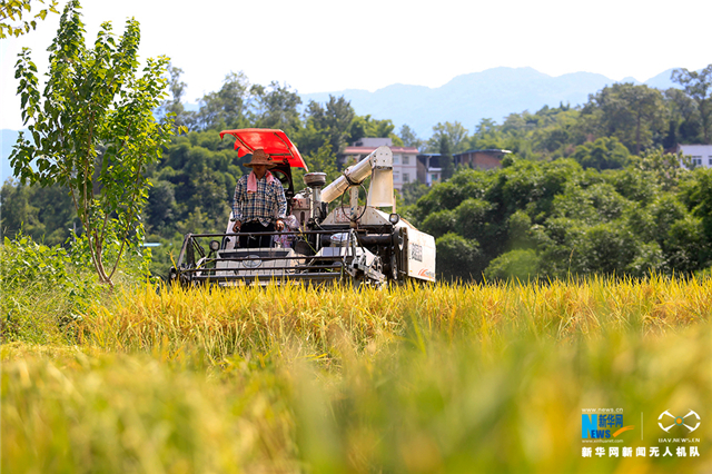 立秋已过,山城渐迎秋意,田野里遍地金黄,农家大院处处是晒秋场景。图为8月9日,一辆收割机在重庆市北碚区三圣镇收割水稻。新华网发(秦廷富 摄)