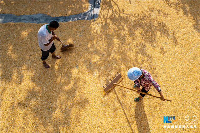 立秋已过,山城渐迎秋意,田野里遍地金黄,农家大院处处是晒秋场景。图为重庆市南川区木凉镇汉场坝村村民在晾晒玉米,农家小院洒满农民“晒秋”的喜悦。新华网发(瞿明斌 摄)