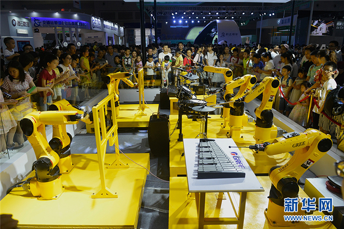 智博会上展出的能够演奏音乐的工业机器人。新华网 李相博 摄