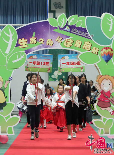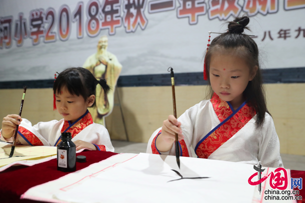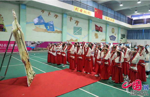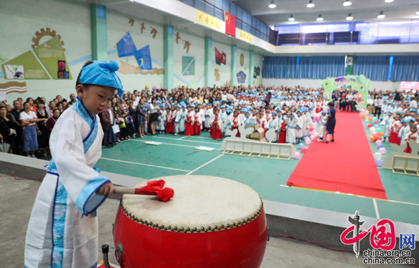 中国网9月14日讯 9月12日,四川省华蓥市双河小学举行学童开笔礼仪式,全校500名身穿汉服的小学新生,通过正衣冠、拜师行礼、朱砂启智、击鼓明志、启蒙描红和诵读《弟子规》等活动,接受中国优秀传统文化的熏陶,勉励自己读书、识字、达礼。(邱海鹰 刘南贤 摄)