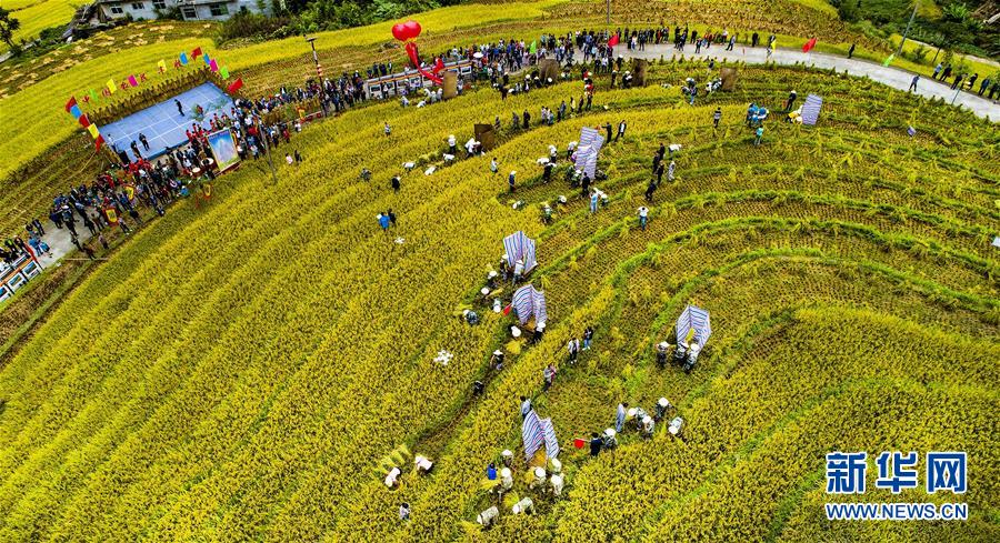 当日,陕西省安康市岚皋县在南宫山镇桂花村有300多年历史的古梯田上举行打谷节活动,庆祝丰收,迎接将要到来的“中国农民丰收节”。新华社记者陶明摄