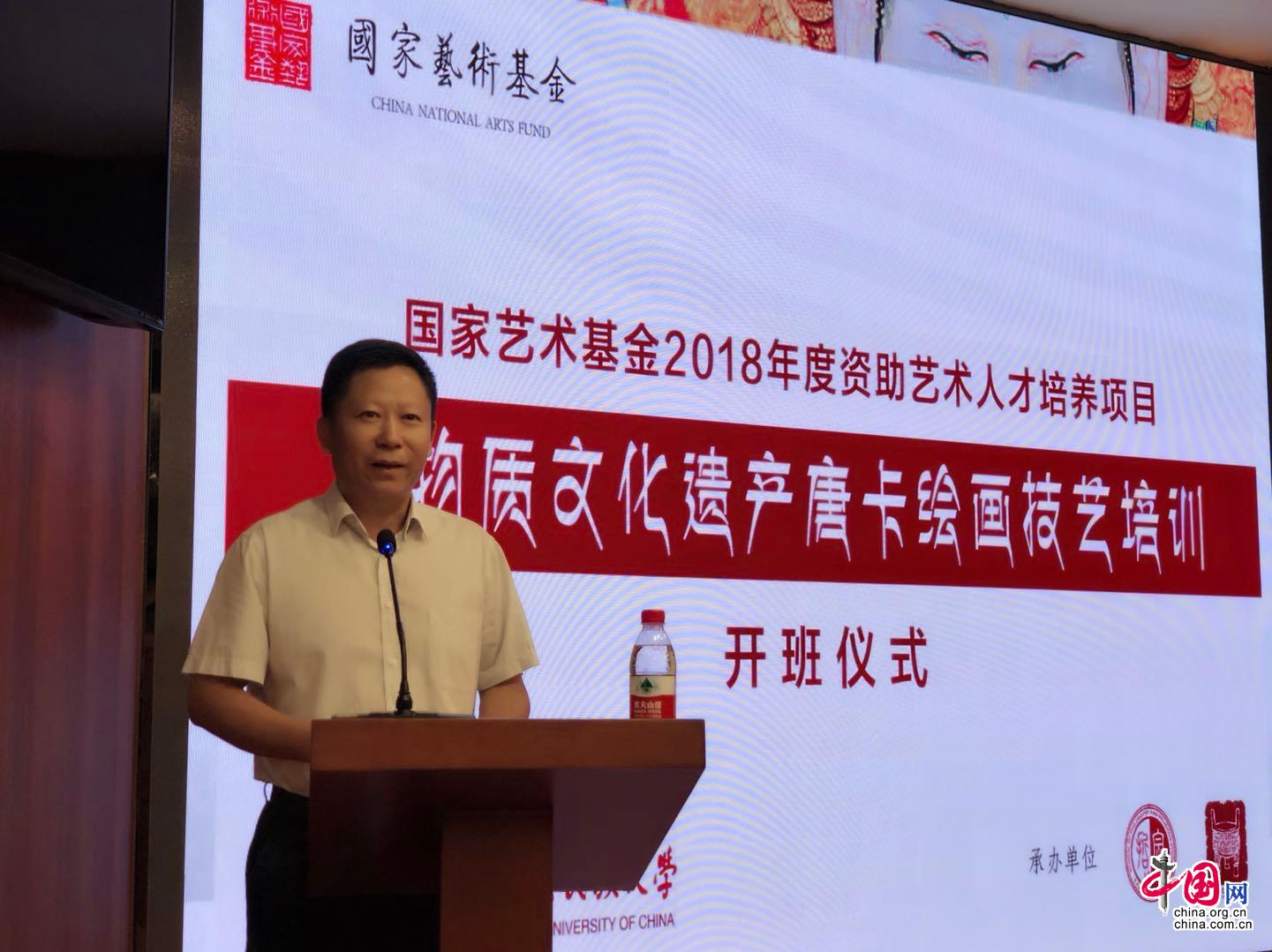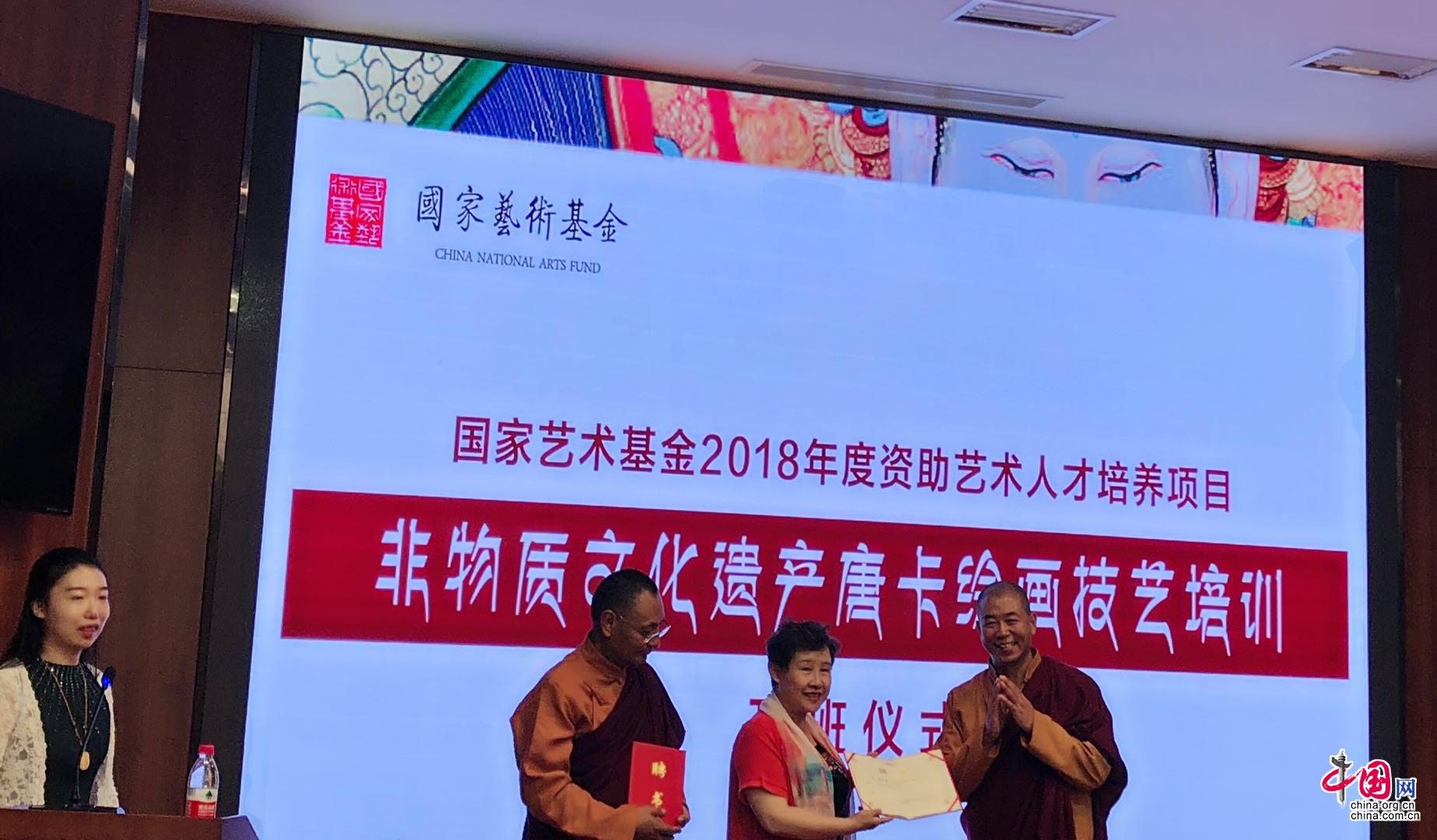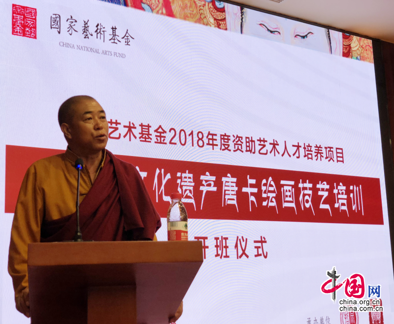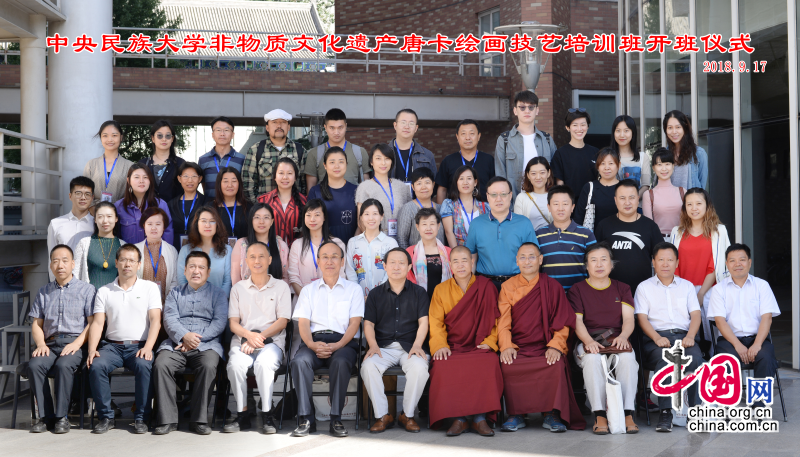 中国网9月19日讯 由国家艺术基金立项资助、中央民族大学主办的“非物质文化遗产唐卡绘画技艺培训”项目,于2018年9月17日在中央民族大学知行堂举办开班仪式。国家博物馆研究员岳峰,中国美术馆研究员、一级美术师丁宗江,中国艺术研究院副院长王福州,清华大学美术学院副院长卢新华,雍和宫管理处副主任刘军以及工艺美术大师、非物质文化遗产传承人希热布、更登达吉等参加了开班仪式。中央民族大学党委副书记马文喜,中央民族大学美术学院书记陈刚,中央民族大学藏学院院长苏发祥,中央民族大学民族学与社会学学院教授张亚莎,中央民族大学哲学与宗教学学院教授谢路军,以及中华文化研究院的有关研究人员,也参加了开班仪式。