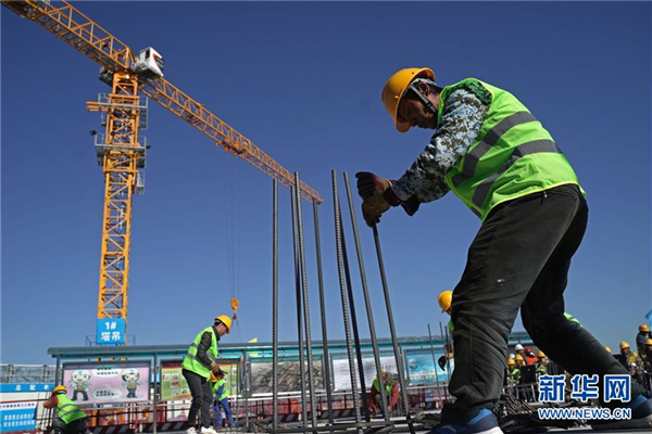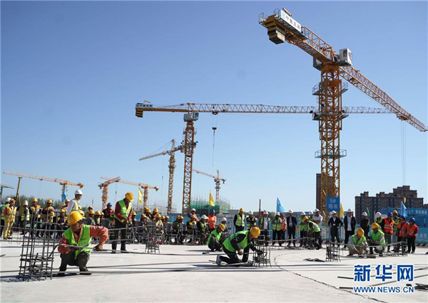 9月24日,在北京市大牛坊社区,中建三局工人进行梁柱钢筋绑扎比赛。 新华社记者 才扬 摄