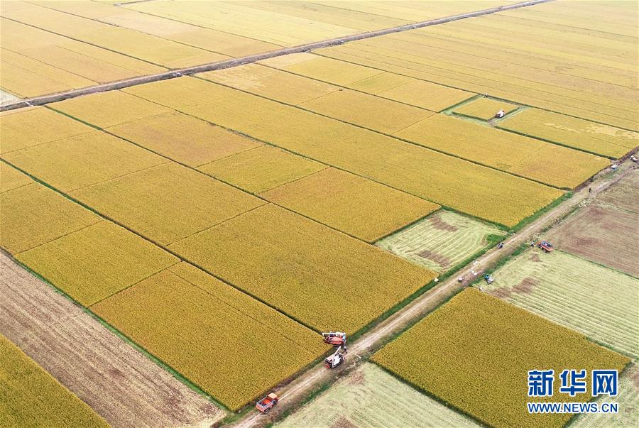 10月15日,收割机在山东省临沂市郯城县郯城街道田间收获水稻(无人机拍摄)。新华社发(张春雷 摄)