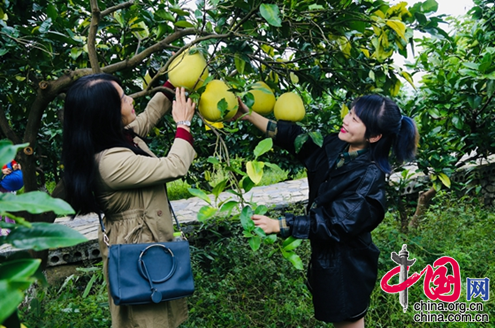 中国网11月2日讯 “今天天气特别好,听说蒲花果园的蜜柚味道不错,我们是专程来采摘几个带回家给家人和朋友品尝。在采果赏花的同时,还可以顺便逛一盘濯水古镇。” 10月31日,正在重庆市黔江区蒲花果园采摘柚子的游客李艳笑着说。