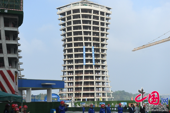 随着大家在工地的体验深入,此次观摩交流的主角——6位“重庆小蛮腰”终于闪亮登场。之所以称之为“重庆小蛮腰”,是因为这6栋地标建筑的外形顶底宽,中间细,层层扭转,酷似风靡全国的传统小吃麻花。但又与麻花对称统一的样子不同,这6栋大楼,每一层都在“扭”,每一层“扭”的还都不一样,恰似“妙龄少女扭动着腰肢”。如此独特的地标造型,顿时勾起了现场不少摄影记者的兴趣,纷纷按动快门扑捉“小蛮腰”的倩影。