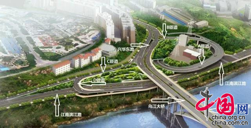 涪陵区城投集团西桥头立交项目负责人贺之恒介绍,涪陵乌江大桥西桥头立交项目按照“一次设计,分步实施”的原则,分两期完成。其中一期工程为C、D匝道及相关附属设施,二期工程为A、B匝道和2个地通工程。该项目通过螺旋匝道(A、B匝道)与滨江大道、兴华东路主线及左转匝道(C、D匝道)形成组合式立交来解决节点交通转换。