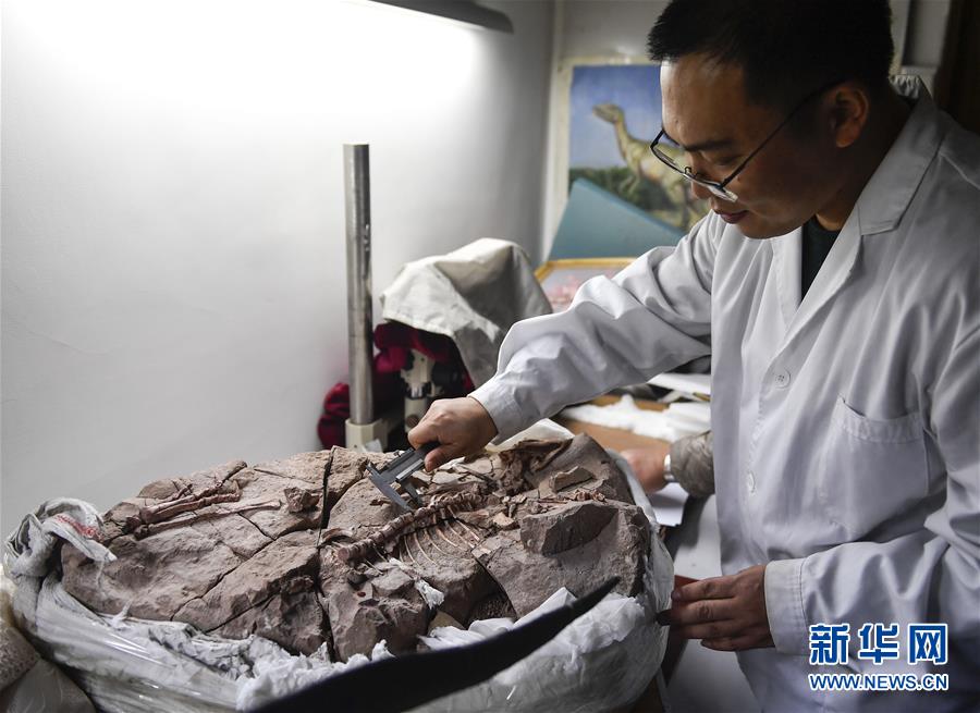 11月20日,吉林大学科研人员在对“长春龙”化石进行测量。 新华社记者 许畅 摄