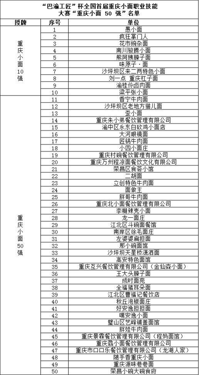 今日,重庆市人社局发布消息,2018 中国技能大赛--第七届全国饭店业职业技能竞赛面条专项赛决赛暨“巴渝工匠”杯全国首届重庆小面职业技能大赛落下帷幕,“重庆小面50强”名单也出炉。