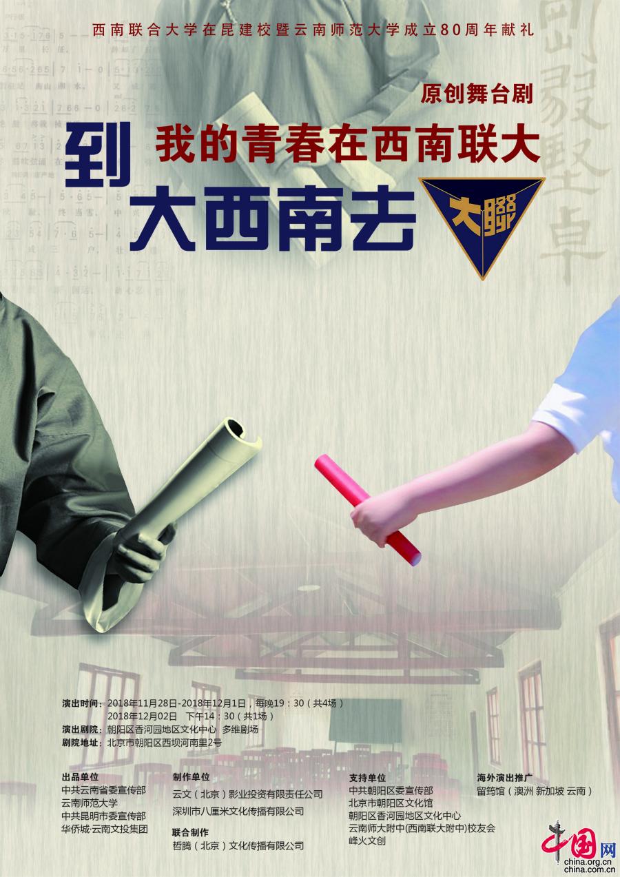 中国网11月30日讯 为了纪念西南联大在昆建校暨云南师范大学成立80周年,继在云南昆明成功首演三场之后,原创舞台剧《到大西南去—我的青春在西南联大》11月28日晚在北京市朝阳区香河园地区文化中心多维剧场首场演出。