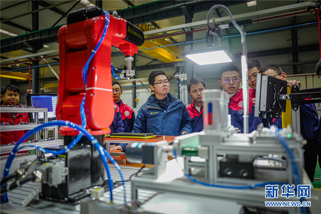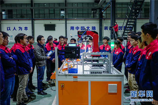 今年6月份,永川科创学院与华中数控共同合作创立科创华数智能制造学院,同学们除了在学校学习理论知识,还需到企业车间进行实践,老师和华中数控的工程师们共同对学生进行智能装备操控的指导。永川作为重庆的职教基地,产教融合的校企共同培养模式,正在为永川,乃至重庆培养大量的技术人才。目前,永川各职业院校正在对接洽谈的永川企业有19个,有望在创业培训、课程共建、顶岗实习、技术服务、订单培养等方面展开深入合作,为智能装备产业发展提供了坚实的人才保障。图为老师和华中数控工程师对同学们进行智能装备操控指导。新华网发(陈科儒 摄)