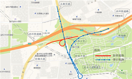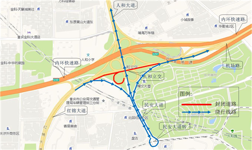 1、原红锦大道(新牌坊立交方向)至机场路或古木峰立交方向车辆请改道:红锦大道(新牌坊立交方向)—人和立交A匝道—民安大道—民安转盘(调头)—民安大道—机场路或古木峰立交方向。