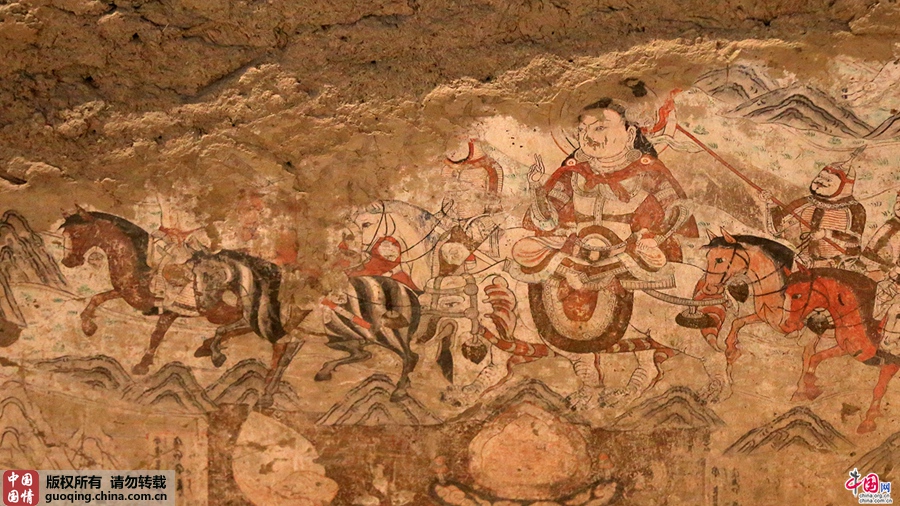 编号S105配殿西壁“王者出行图”位于西壁北半部上方