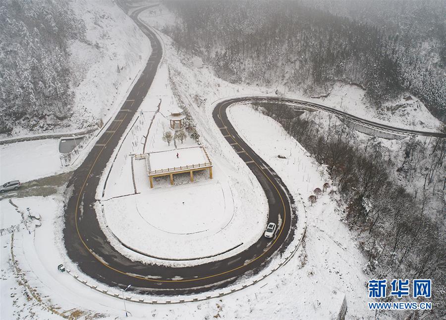 12月9日,在安徽省霍山县太阳乡金竹坪村,一辆汽车驶过大别山旅游扶贫通道(无人机拍摄)。 新华社发(徐程 摄)