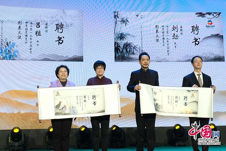 北京世园会执委会副主任兼秘书长、北京市副市长王红为吕植颁发聘书。北京市委副秘书长、市委宣传部副部长余俊生为刘劲颁发聘书。
