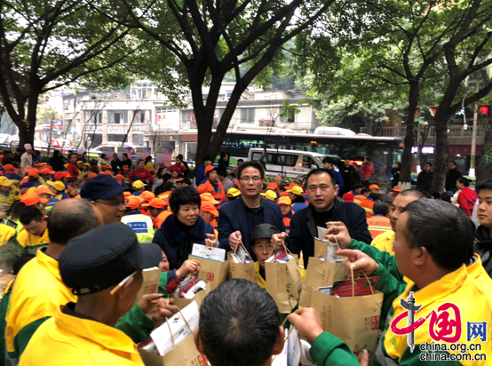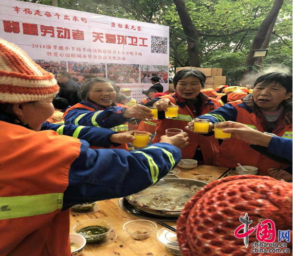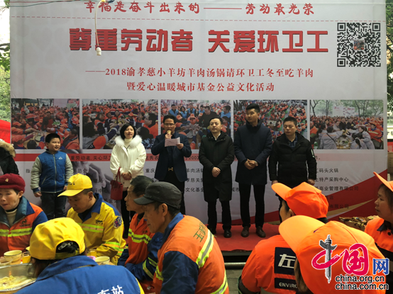 中国网12月24日讯 (岳思佳) 大地作纸,汗水当墨,扫帚为笔,绘美如画。12月23日,以“尊重劳动者、关爱环卫工”为主题的2018渝孝慈小羊坊羊肉汤锅店请环卫工冬至吃羊肉暨重庆广德公益慈善文化基金会“爱心温暖城市基金”公益文化活动在沙坪坝区天星桥举行。