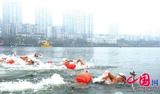 在畅游汉丰湖比赛中,600余名冬泳健儿齐上阵,只要完成800米赛程均可记分,且不计排名、不计时间。