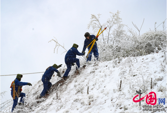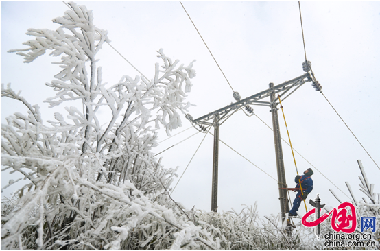 连日来的低温寒潮天气,使四川省华蓥山区被冰雪覆盖,国家电网华蓥市供电公司为确保供电线路安全稳定运行,及时组织抢险人员对覆冰地带的线路进行破冰,保障高寒山区群众新年用电安全。( 邱海鹰 任勇 摄)