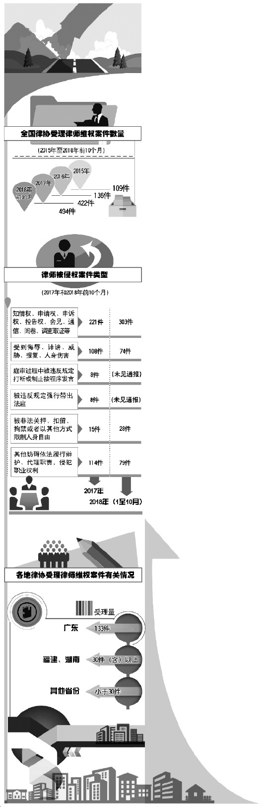 全国律师协会维护律师执业权利中心已公布的2018年前10个月工作情况显示,全国各地律师协会共受理维权案件494件,已超过2017年全年422件的受理量。