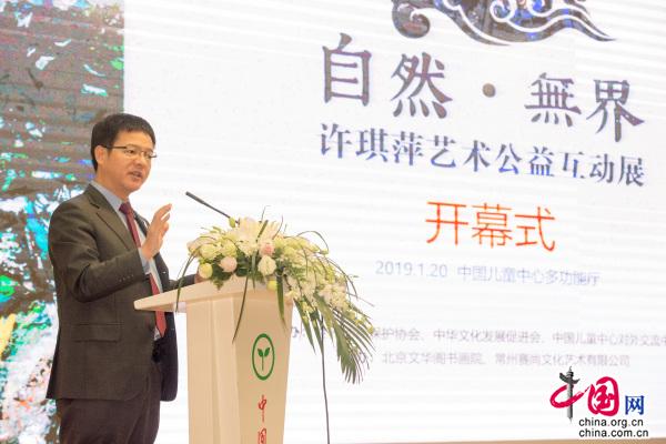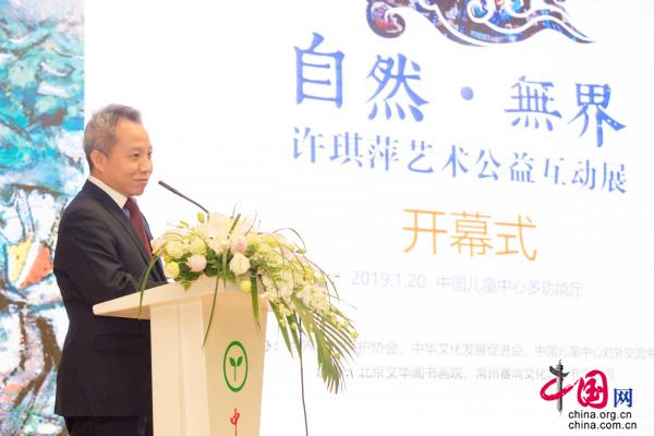 中国网讯 2019年1月20日,《自然·无界》许琪萍艺术公益互动展在中国儿童中心拉开帷幕。此次艺术活动由世界动物保护协会、中华文化发展促进会、中国儿童中心交流中心联合主办,北京文华阁书画院和常州赛尚文化艺术有限公司承办。全国政协副秘书长,民进中央副主席、著名教育家朱永新,中华文化发展促进会秘书长沈永峰,中华全国妇女联合会国际部原副部长龙江文,中国儿童中心副主任寇虎平,世界动物保护协会(英国)北京代表处首席代表赵中华在开幕式上致辞。